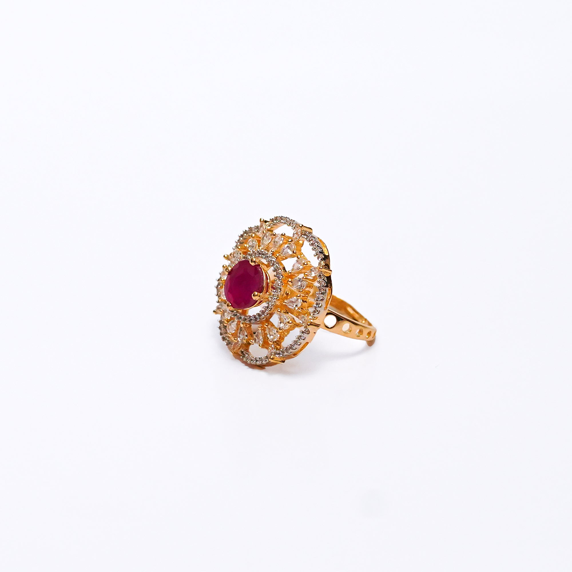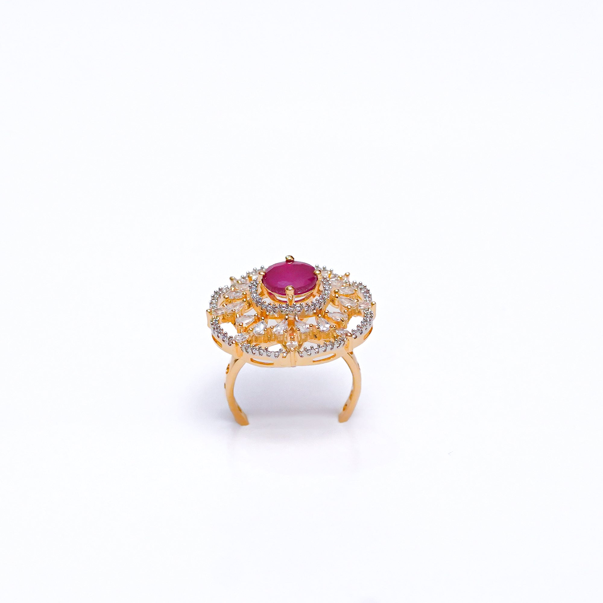 Make a statement of timeless elegance with this gold-plated adjustable ring, featuring a stunning ruby red stone at the center, beautifully encircled with sparkling Cubic Zirconia (CZ) diamonds. The intricate floral-inspired design gives this ring a luxurious touch, making it the perfect accessory for both traditional and modern outfits.