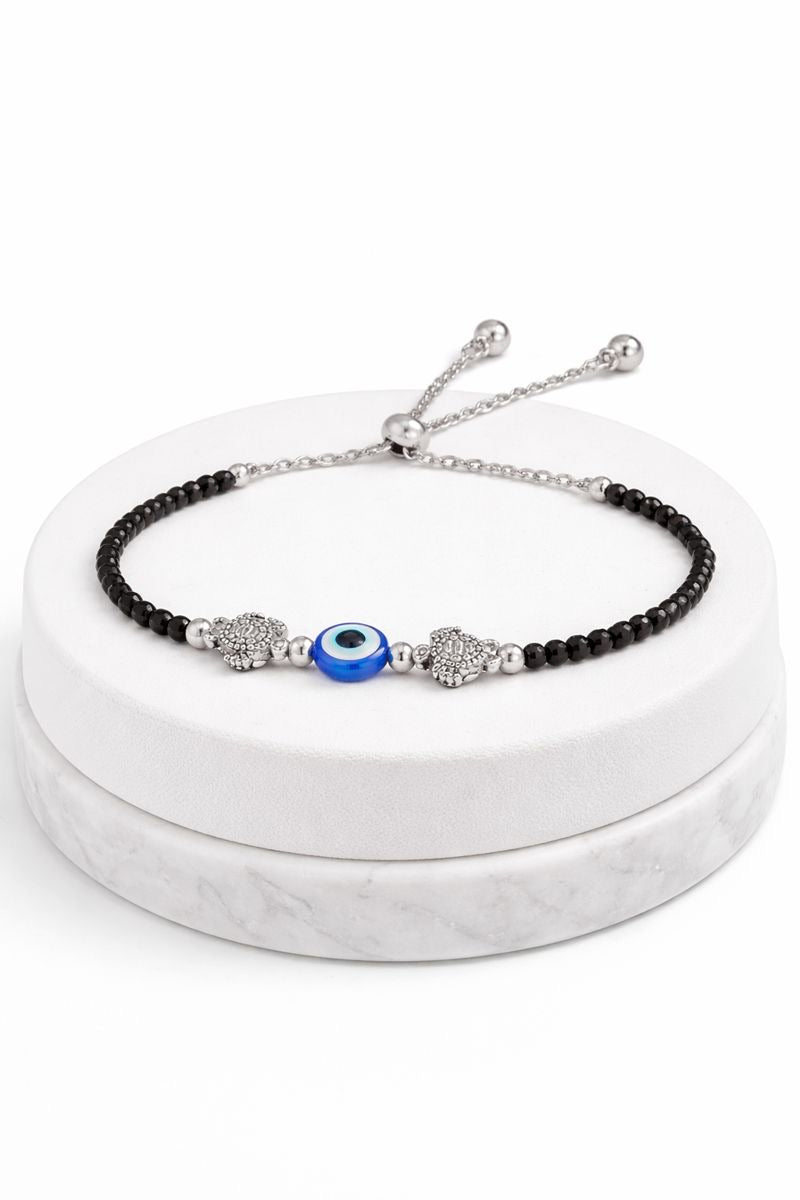 Add a touch of elegance, positivity, and protection to your everyday style with this Evil Eye Turtle Black Beads Bracelet. Designed with finely crafted black crystal beads, a symbolic blue evil eye charm, and detailed silver turtle accents, this bracelet blends modern fashion with meaningful symbolism.