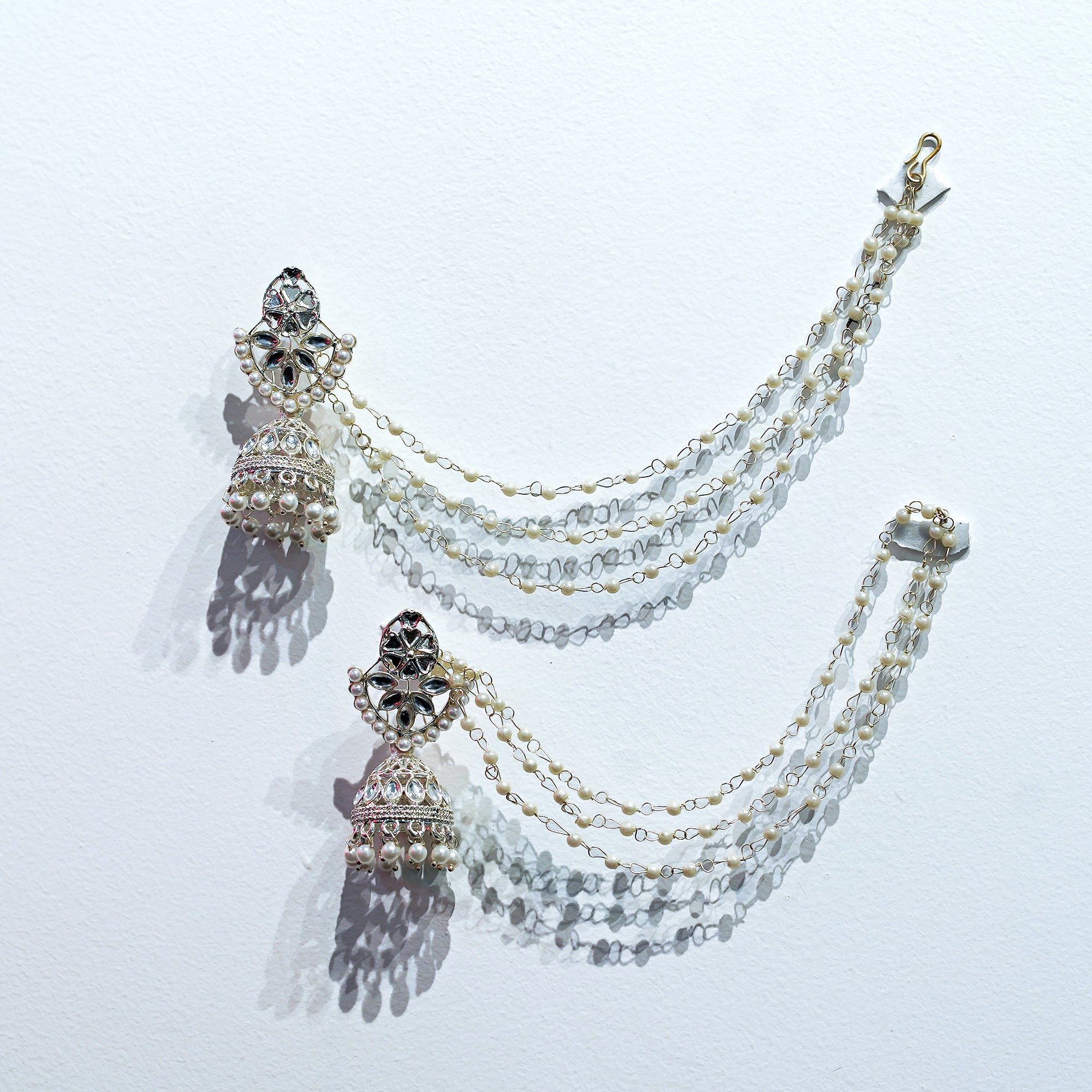 The double-layered pearl ear chain adds a touch of sophistication, making these earrings a perfect choice for weddings, engagements, parties, and cultural celebrations. Crafted with precision, these ethnic Indian jhumkas strike the right balance between tradition and modern glamour.